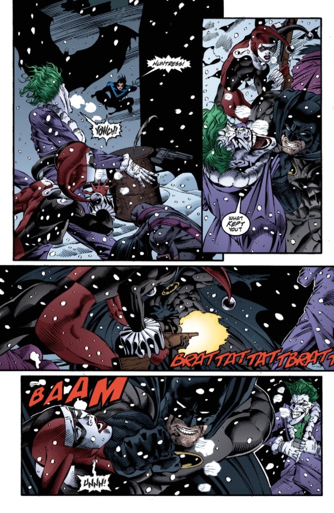 The Joker and Harley have taken Huntress to lure Batman and Nightwing to their trap. It’s quite horrific; Joker kidnaps 36 infants and threatens an explosion, on Christmas Day of all day’s. Harley dressed as Joker as a diversion for Batman. Eventually he catches her and she gives up the location of the babies. She begs for her life; Batman let’s her go. She doesn’t reappear in this issue after here, however,I won’t get into the gory details of the ending, I’ll allow you to experience that at your own free will.