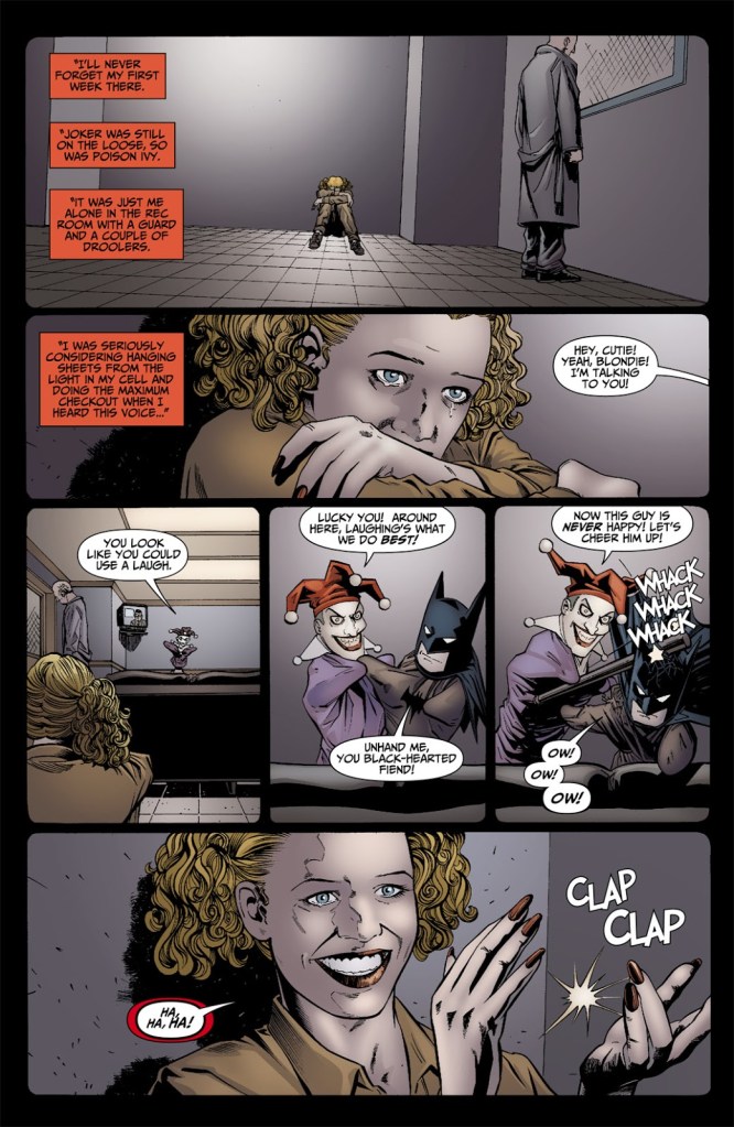 We learn her reasons are due to the original Ventriloquist cheering Harley up and persuading her decisions on whether or not to do the “maximum checkout” in her cell; (commit suicide). He performs a puppet show for her, causing her to laugh for the first time in weeks.