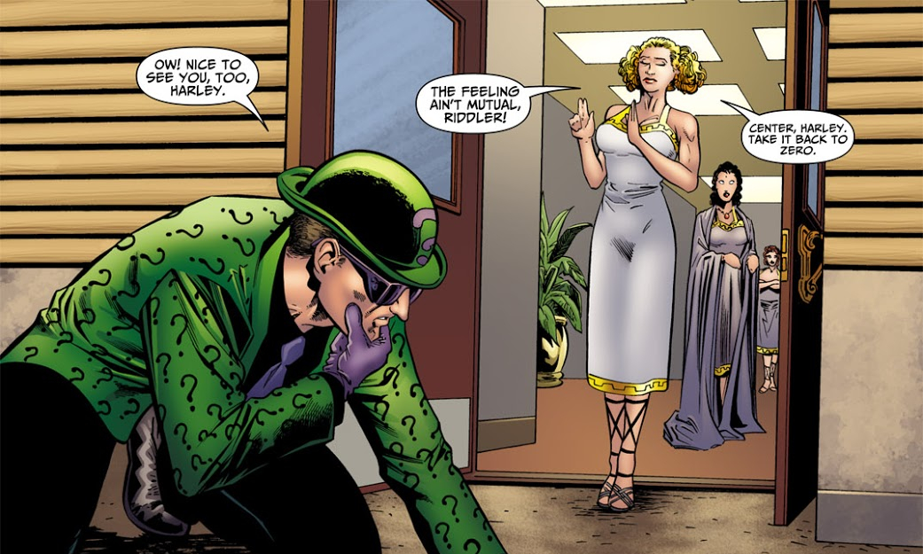 Harley has taken residence at Athenian Women’s Help Shelter with hope for a new way of life. This doesn’t last long as The Riddler shows up looking for her. We enjoy their civil friendship here as they work together to solve a missing persons case. We hear all about Harley’s Secret Six experience and see her in springy action alongside Amazons!