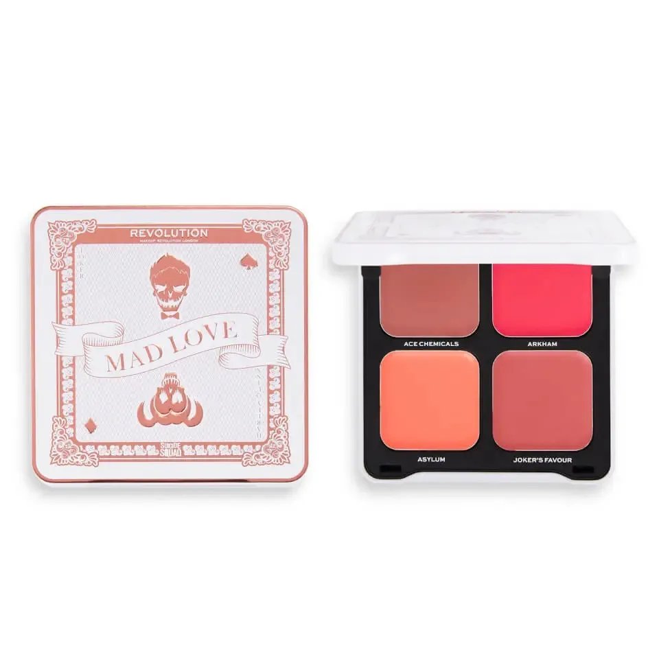 “Discover your inner loveable rogue with this DC x Revolution Cream Blusher Quad. Featuring four seductive blush tones that will give you a natural, healthy radiance, this quad features shade names including ‘ACE CHEMICALS’, ‘ARKHAM’, ‘ASYLUM’ and ‘THE JOKERS FAVOUR’, inspired by The Joker and Harley Quinn’s mad love. This makes the perfect Valentine’s Day gift for the DC fan in your life.”